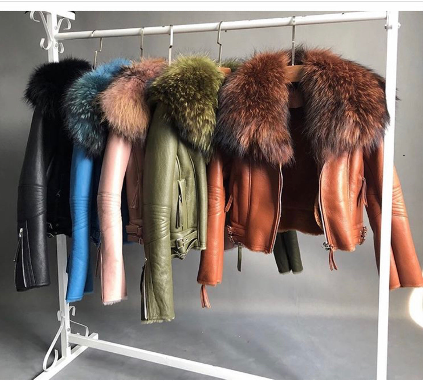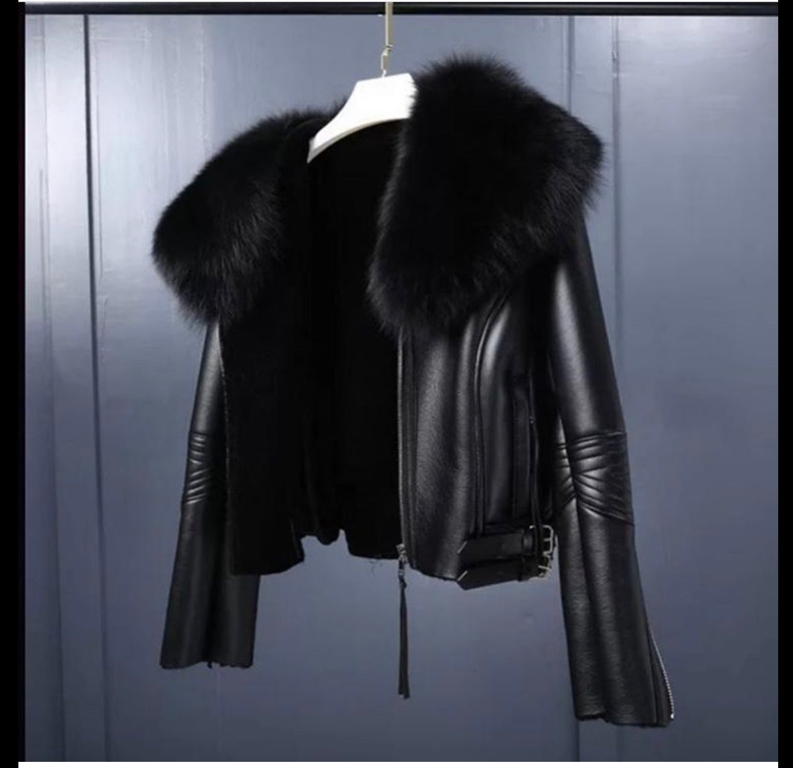 This beautiful leather coat is leather on the outside and sheep fur on the inside while the collar is blooming with real raccoon and fox fur.